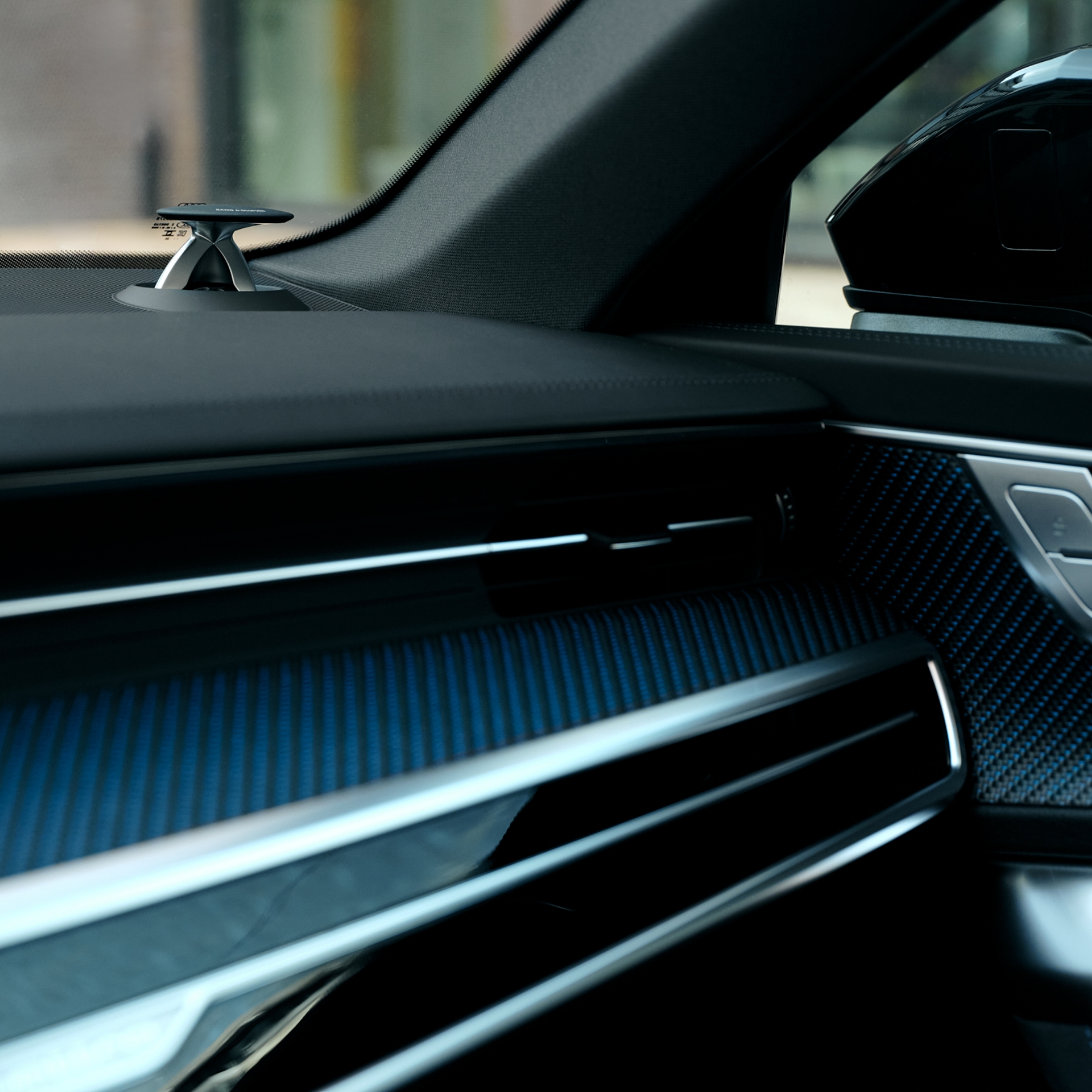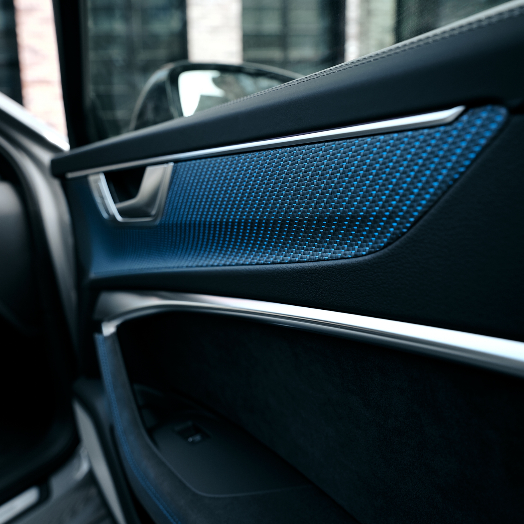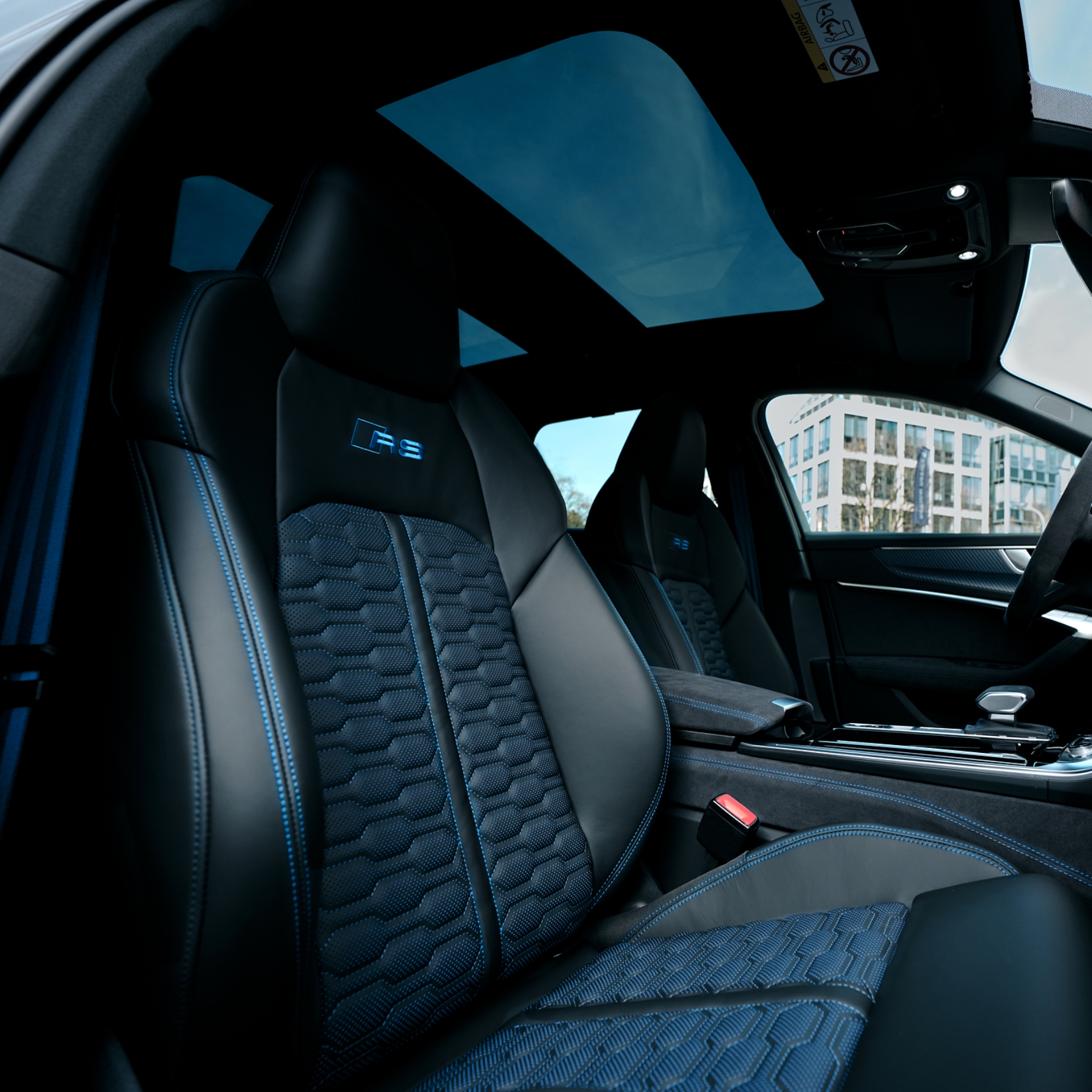 A wide stance, 22-inch wheels, and a bold side profile give the RS6 an unmistakable presence. Deep-tinted windows and the striking HD Matrix LED headlights with Audi Laser Light add refined aggressiveness. In Nardo Grey with blue interior accents, it stands out with sporty elegance, premium carbon fiber details, and a distinctive design signature.